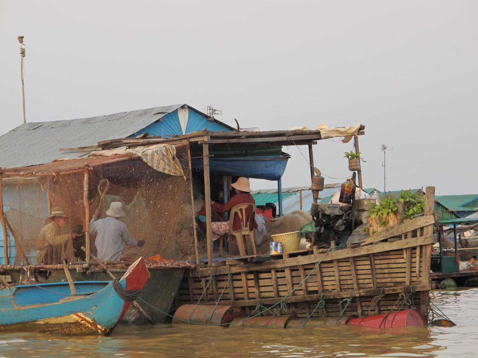 motor looked like some kind of Frankenstein contraption and didn't sound like it was going to get us out of the tributary to the river. As we pulled away another boy, maybe in his late teens, jumped aboard. He came to sit by us, introducted himself and began to ask us the usual questions: what's your name, where are you from, etc. I raised an eyebrow at Phyl. It appeared that we were going to have a “tour guide” whether we wanted one or not. Not long after the "tour guide" arrived, a small boat pulled along side our boat and a child of about 7 years jumped, as though we were all on solid ground, from his boat to ours, with a basket of ice and cokes. We declined and he jumped off as quickly as he had arrived. It was so startling and unanticipated that we sat in shock about his gazelle leap , the speed of the boats, and his young age. As we rode, he gave us the history of the area, the lake, and the Vietnamese people (now so long in Cambodia that they consider themselves Vietnamese- Cambodians) who live in the floating village. Basically it was everything we had read in the guidebook.