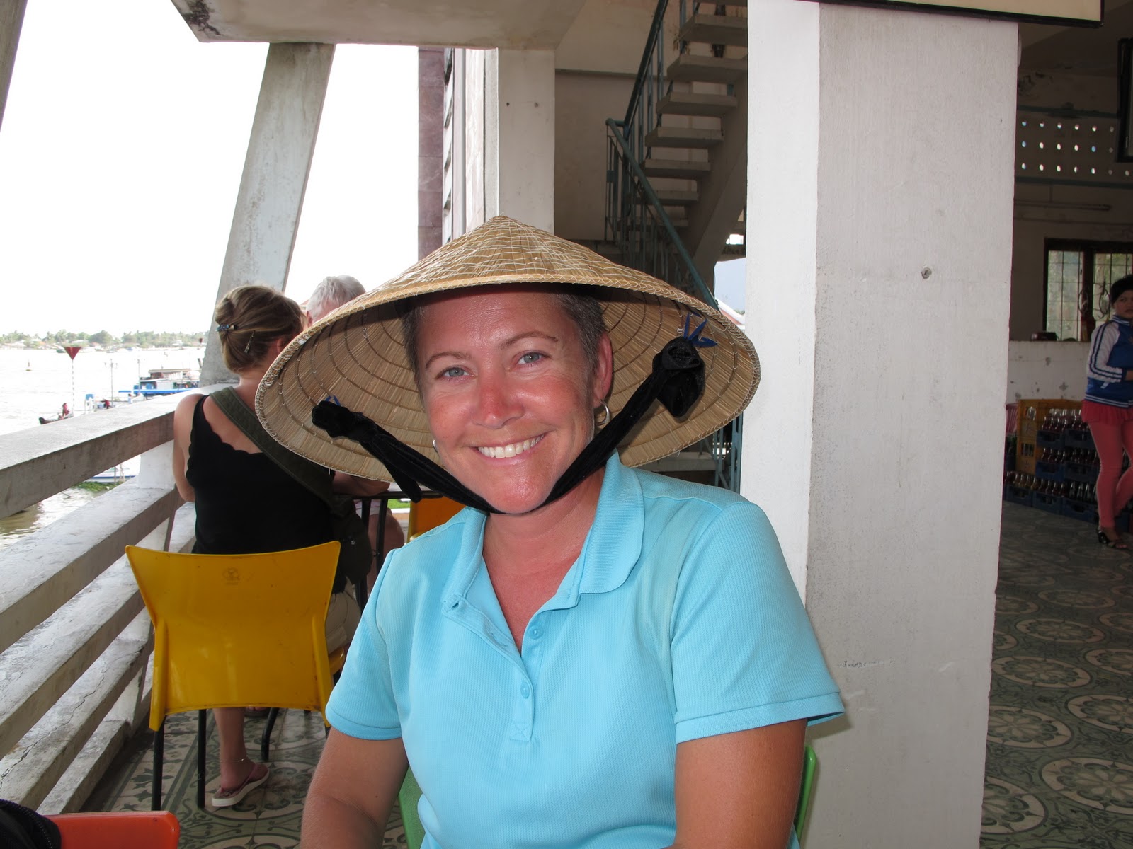 We lounged, drank our coffee, then walked to, and along the river. We ate lunch at Mekong Cafe, walked to a statue of Uncle Ho (Ho Chi Minh, ruler of Vietnam after the war), sat on a bench and watched the river traffic and pedestrians go past, and drank a few beers at a 2nd story cafe where the owner found us to be quite amusing and let us take pictures in her conical hat. We sat for several hours at her cafe watching several boats being loaded with cargo, presumably to be taken up or down the river.